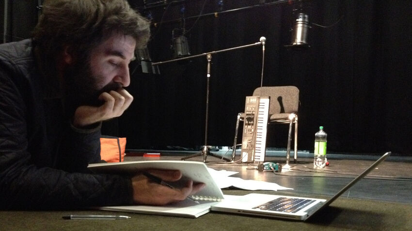 One man. One small keyboard. With batteries. And a chair. And a mic. And cables. And a sound system. And then a room, obviously. With more chairs. And a lighting rig. It’s surprising how much stuff is involved actually.
